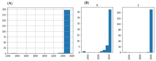 Small RNA-seq of 200 saliva samples yielded ~4 642 M raw sequencing reads (from ~13.7 M to ~39.3 M reads/sample). Pre-filtering and filtering steps retained 70% (~3205 M) of initial raw reads. The majority of filtered reads were of short read length. Quantification of filtered reads and identification of known miRNAs yielded ~190 M sequences to be mapped to 2561 known miRNAs from miRBase v21. The number of expressed miRNAs ranged from 1250 (outlier) to 2561 per sample. The distribution of expressed miRNAs in the 200 saliva samples and the overall composition of processed reads are shown in Figure 1A,B and Figure 2.