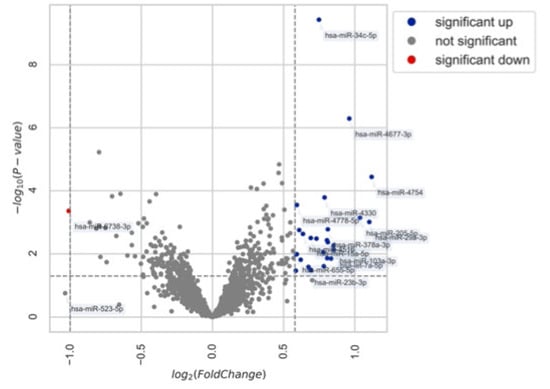Volcano plot of expressed miRNAs in saliva for endometriosis.