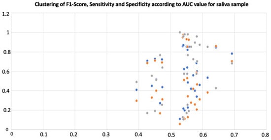 Clustering of accuracy values. In blue: F1-Score; In orange: Sensitivity; In grey: Specificity.