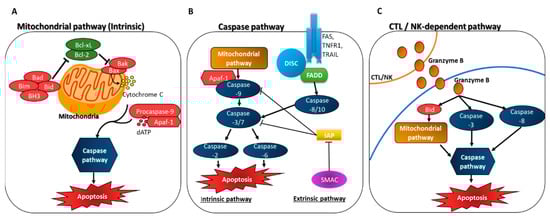 Many apoptosis-inducing stimuli activate caspases through one of the following three major pathways: (i) the mitochondrial pathway (intrinsic pathway), (ii) the death receptor pathway (extrinsic), and (iii) the cytotoxic T lymphocytes/natural killer cells (CTL/NK)-dependent pathway [] (Figure 1).