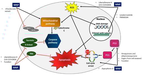 Some MNPs were found to affect CRC and PC cells through caspase activation pathways. Caspases are protease enzymes that have essential roles in programmed cell death (apoptosis) []. Caspases-2, -3, -6, -7, -8, -9, and -10 are activated during apoptosis. Caspases-2, -8, -9, and -10 are called apical or upstream caspases, and are responsible for initiating caspase activation cascades. Caspases-3, -6, and -7 are called downstream caspases, and are responsible for the actual destruction of the cell during apoptosis []. During activation, apical caspases distribute death signals and activate downstream caspases in a cascade-like manner []. Downstream caspases then cause direct cellular structures disintegration, cellular metabolism disruption, cell death, inhibitory proteins inactivation, and additional destructive enzymes activation []. For example, marine sponge metabolites ilimaquinone and ethylsmenoquinone were found to activate caspase-3 and induce apoptosis via this pathway [].