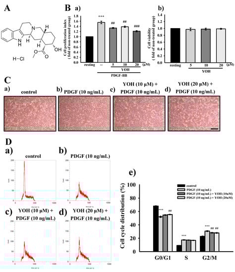 Effects of YOH on PDGF-BB-induced proliferation and cell cycle progression in MOVAS-1 cells. (A) Chemical structure of YOH. (B) Starved MOVAS-1 cells (4 × 104 cells/well) were pretreated with YOH (5, 10, and 20 μM) for 45 min and then treated with PDGF-BB (10 ng/mL) for 48 h, and the cell cycle progression was monitored for 18 h. The cell proliferation index (a) and cell viability (b) were measured as described in the Materials and Methods section. (C) Images of the morphology of MOVAS-1 cells stimulated without (a) or with (b) PDGF-BB (10 ng/mL) after pretreatment with YOH at (c) 10 or (d) 20 μM, the black bar indicates 100 μm. (D) Cells were pretreated without (a) or with (b) solvent control (0.1% DMSO), (c) 10 μM YOH, or (d) 20 μM YOH and then stimulated with PDGF-BB (10 ng/mL) for 18 h. The samples were collected by trypsinization and then subjected to flow cytometry. The complied statistical data are included (e). *** p < 0.001, compared with the resting group; ## p < 0.01 and ### p < 0.001 compared with the solvent control group. Data are presented as the mean ± S.E.M. (n = 4).