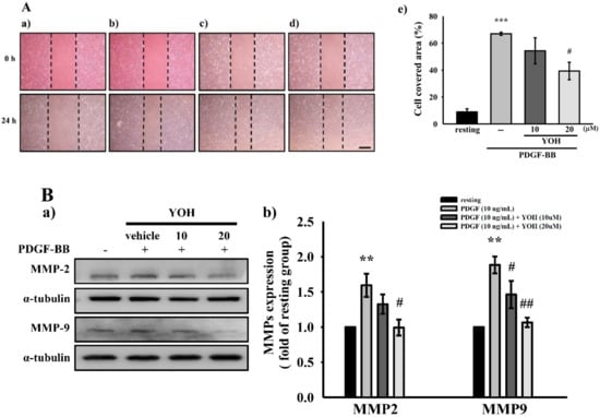 To investigate whether YOH influences cell migration in response to PDGF-BB in VSMCs, we conducted a wound healing assay to evaluate the migratory capacity of the cells [27]. We also examined the expression levels of MMP-2 and MMP-9—two critical metalloproteinases in vascular remodeling and VSMC migration [28,29]—in PDGF-BB-stimulated MOVAS-1 cells treated with or without YOH. As displayed in Figure 2A(a–e), YOH pretreatment (20 μM) significantly inhibited PDGF-BB-induced MOVAS-1 cell migration. Moreover, the expression levels of MMP-2 and MMP-9 were substantially increased in the PDGF-BB-stimulated (10 ng/mL) MOVAS-1 cells, and the preincubation of the cells with YOH (10 and 20 μM) suppressed the expression of MMP-2 and MMP-9 in a concentration-dependent manner (Figure 2B(a,b)). YOH pretreatment also exhibited strong migration inhibition activity in the PDGF-BB-stimulated MOVAS-1 cells.