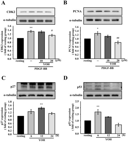 As presented in Figure 3A,B, PDGF-BB administration (10 ng/mL) significantly upregulated CDK2 and PCNA expression in the MOVAS-1 cells, and YOH pretreatment (20 μM) substantially attenuated PDGF-BB-induced CDK2 and PCNA expression. We further investigated the protein expression of negative cell cycle modulators such as p27Kip1 and the tumor suppressor p53 in YOH-treated MOVAS-1 cells. The protein expression levels of p27Kip1 and p53 were significantly induced after YOH administration (20 μM; Figure 3C,D). These results suggest that YOH caused G0/G1 cell cycle arrest in the PDGF-BB-stimulated MOVAS-1 cells by modulating these cell-cycle-associated proteins.