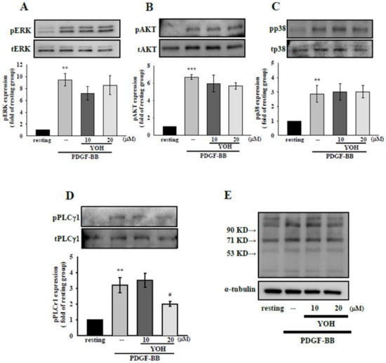To clarify the mechanisms underlying the effects of YOH against PDGF-BB-stimulated VSMC activation, we examined the expression of PDGF-mediated signaling pathways such as the MAPK, AKT, and PLCγ1 pathways [7,8]. We observed that PDGF-BB treatment (10 ng/mL) significantly upregulated p38MAPK, ERK1/2, AKT, and PLCγ1 phosphorylation in the MOVAS-1 cells (Figure 4A–C). Nevertheless, YOH administration at 20 μM substantially attenuated only PLCγ1 phosphorylation in the PDGF-BB-stimulated MOVAS-1 cells (Figure 4D). PDGF-BB-induced ERK1/2, AKT, and p38MAPK phosphorylation in the MOVAS-1 cells was not affected by YOH. Moreover, as illustrated in Figure 4E, YOH treatment (20 μM) also inhibited the expression of PLCγ1-derived phosphorylation of Ser residues [30] in PDGF-BB-stimulated MOVAS-1 cells.