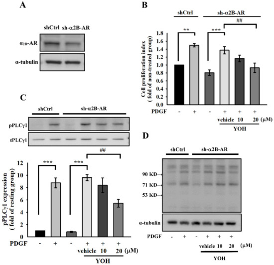 YOH served as a selective α2-adrenergic receptor antagonist. The α2-adrenergic receptor belongs to a family of G protein-coupled receptors and consists of three highly homologous subtypes: α2A-, α2B-, and α2C [31]. Among them, the α2B-adrenergic receptor subtype has been reported to be involved in VSMC proliferation [20,25]. Accordingly, we performed α2B-adrenergic receptor knockdown in the MOVAS-1 cells (Figure 5A) to determine whether the inhibitory effects of YOH on cell proliferation and PLCγ1 proliferation in the PDGF-BB-stimulated MOVAS-1 cells were associated with its α2-receptor antagonism. As displayed in Figure 5B, YOH treatment still substantially inhibited PDGF-BB-induced cell proliferation in MOVAS-1 cells with an α2B-adrenergic receptor knockdown. In addition, YOH attenuated both PLCγ1 phosphorylation and downstream Ser residue phosphorylation in PDGF-BB-stimulated MOVAS-1 cells with an α2B-adrenergic receptor knockdown (Figure 5C,D).