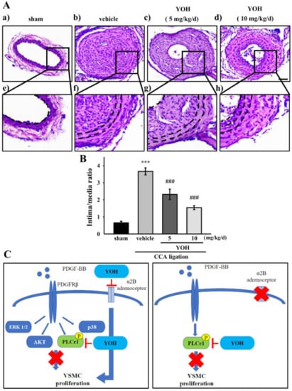 Effect of YOH on neointimal formation induced in mouse model of CCA ligation. (A) C57BL/6 mice were treated with vehicle or YOH (5 or 10 mg/kg) for 21 days after CCA ligation. The carotid arteries were harvested after 21 days. All CCA cross sections were stained with H&E; the representative patterns were obtained from five independent experiments. Arrowheads indicate elastic lamina, and the black bar indicates 100 mm. (a) sham, (b) vehicle, (c) YOH (5mg/kg/d), (d) YOH 10 mg/kg/d; (e–h) magnified parts of (a–d); (B) Quantifications of mean intimal thickness and intimal–medial layer ratio. Data are presented as the mean ± S.E.M. (n = 5 for each experimental group). *** p < 0.001 compared with the sham group; ### p < 0.001 compared with the injured group. (C) Schematic of the inhibitory mechanism of YOH in wild-type cells and VSMCs with α2B-adrenergic receptor knockdown. YOH inhibited PDGF-BB-induced proliferation by suppressing PLCγ1 phosphorylation but not ERK1/2, AKT, or p38. Similarly, YOH treatment still inhibited cell proliferation through PLCγ1 phosphorylation downregulation in PDGF-BB-stimulated VSMCs with α2B-adrenergic receptor knockdown.
