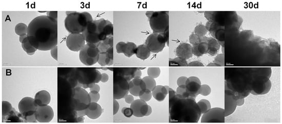 Al NPs were much more stable under PBS conditions than in ultrapure water, as demonstrated in Figure 1. After around 3 days, the Al NPs in ultrapure water began to degrade, and filamentary oxide structures began developing on the surfaces. The Al NPs were clearly oxidized after 14 days. No metallic Al NPs were observed in the TEM images after 30 days (Figure 1A). The Al NPs, on the other hand, had smooth surfaces with no visible oxide development after the same duration of PBS treatment (Figure 1B). These results demonstrate that the PBS environment can provide better protection for Al NPs against oxidation during assembly in an aqueous solution.
