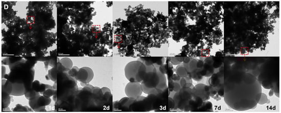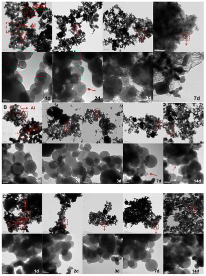The micromorphology of Al and CuO combined in various solutions is shown in Figure 3. After about 2 days, the Al NPs in the H2O/Al/CuO comixture began to degrade. On Day 3, nodules began to build oxide structures on their surfaces. By Day 7, Al NPs were visibly oxidized, and spherical Al NPs had vanished, leaving the oxidized areas flocculent. However, after about 7 days, Al NPs in the H2O/SH-25/Al/CuO comixture began to degrade. We previously showed that SH-25 had a particular binding impact on CuO NPs and Al NPs in a prior investigation []. As a result of the minor protection of SH-25 in ultrapure water, Al NPs in H2O/SH-25/Al/CuO comixture were slightly oxidized. Al NPs in PBS/SH-25/Al/CuO and PBS/Al/CuO comixtures, on the other hand, showed no noticeable alterations in micromorphology. It appears that adding SH-25 to the PBS solution did not affect the aqueous stability of Al NPs. Furthermore, TEM images revealed that SH-25-directed Al/CuO nanocomposites were covered with each other and had rather uniform distributions. This implies that using a peptide assembly method can improve the advantage of phosphate buffer (PBS, 0.01 M, pH 7.0) in reducing Al oxidation and increasing the degree of homogenous intermixing between the Al and CuO components.