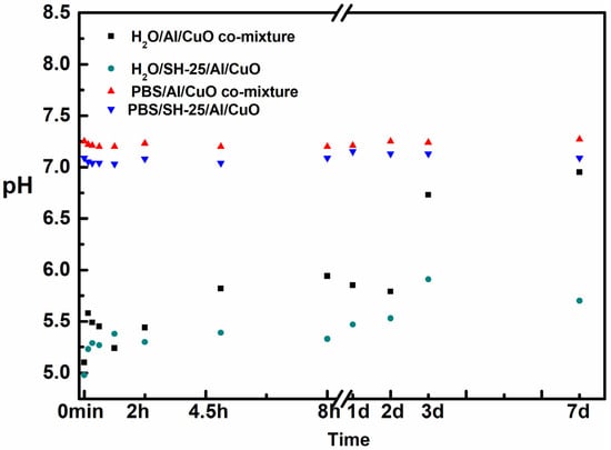To further study the protective interactions between them, the pH of these systems was tested during the time of this study (Figure 4). A variation of pH was observed for the aqueous solution in the H2O/SH-25/Al/CuO and H2O/Al/CuO comixture system due to the slow oxidation of Al NPs. The pH increased from 5.1 to 7.0 within 7 days when the solution was in H2O. In the H2O/SH-25/Al/CuO system, the pH increased from the original 5.0 to 5.7. A higher pH change was observed in the H2O/Al/CuO system, indicating that the oxidization of Al NPs took place at a faster rate, which coincides with the results obtained from TEM.
