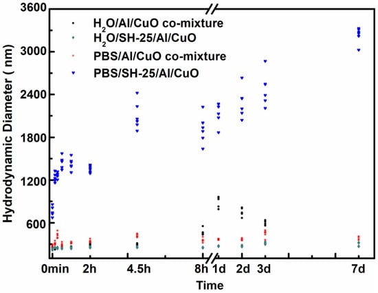 Impact of assembly time on the hydrodynamic diameter. The red dots depict the PBS/Al/CuO comixture. The blue dots denote the PBS/SH-25/Al/CuO. The black dots represent the H2O/Al/CuO comixture (owing to the oxidation of Al NPs and the substantial change in particle size, the hydrodynamic diameter was not given on the 7th day). The cyan dots represent H2O/SH-25/Al/CuO.