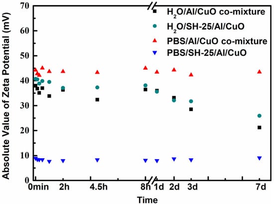 The zeta-potential values of the corresponding systems were investigated to learn more about their ζ interactions (Figure 6). In 2 days, the absolute value of the zeta potentials of the PBS/Al/CuO comixture, H2O/Al/CuO comixture, and H2O/SH-25/Al/CuO was above 30 mV (the absolute value of the zeta potentials slightly decreased owing to the oxidation of Al NPs), suggesting the relative stability of these systems, with the mean particle dimensions manifesting no increment. The addition of peptide SH-25 to CuO and Al in a PBS dispersion, however, resulted in a significant reduction in the absolute zeta potential of the CuO and Al-based nanocomposite, which decreased to about 10 mV, demonstrating the effective conjugation of CuO and Al NPs with SH-25.