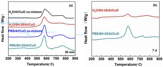 Heat release DSC plots of nanothermites. (a) Al and CuO assembled for 30 min. (b) Al and CuO assembled for 7 d.