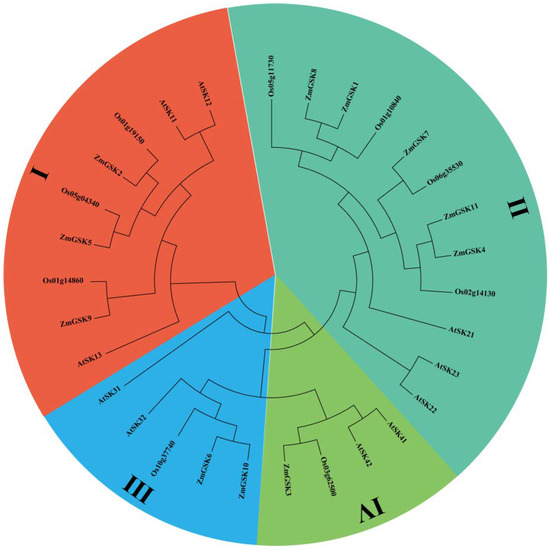 In order to precisely reveal the evolutionary relationships of the ZmGSK proteins, we performed phylogenetic analyses on 30 GSK proteins, including 11 maize, 10 Arabidopsis, and 9 rice GSKs, using the neighbor-joining method (Figure 1). All proteins were categorized into four groups (I, II, III, and IV). Meanwhile, the number and protein sequences of ZmGSKs were more similar to those of OsGSKs than to those of AtASKs, indicating that GSKs from maize have a closer relationship with GSKs from rice than with those from Arabidopsis. This shows that the GSK gene is not highly conserved in the evolution of species and diversified during its evolution.