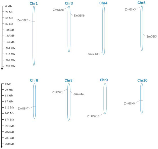 Distribution of ZmGSK genes on maize chromosomes. The scale represents megabases (Mb).