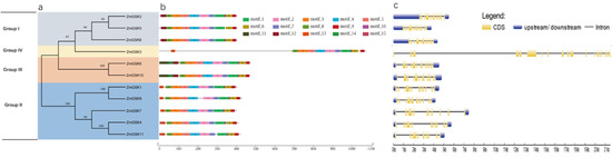 Phylogeny, exon–intron structures, and motif analysis of ZmGSKs. (a) Phylogenetic tree of ZmGSK. (b) Conserved motif analysis of ZmGSK OPF translations. Motifs were designated 1–10 and distinguished with different colors. (c) Exon–intron structures of ZmGSK genes. The full-length mRNA sequences of ZmGSK genes were analyzed and displayed. Coding sequences (CDSs) are represented by yellow boxes, untranslated regions (UTRs) are shown as blue boxes, and introns are represented by blank lines. The scale at the bottom represents lengths.