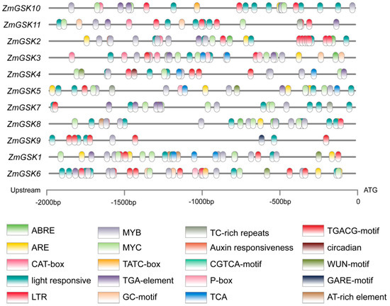 To further understand how ZmGSK genes are regulated, we detected their upstream promoter sequences (2000 bp upstream of the coding region) and subjected them to cis-acting element prediction using PlantCARE. Twenty cis-acting elements, including abscisic-acid responsiveness (ABRE), low-temperature responsiveness (LTR), TGA elements (auxin responsiveness), MeJA responsiveness (CGTCA motif), circadian control (circadian), anaerobic induction (ARE), MYB binding site (MYB), anoxic-specific inducibility (GC motif), gibberellin-responsive element (P-box), wound responsiveness (WUN motif), meristem expression (CAT-box), MYC, defense and stress responsiveness (TC-rich repeats), salicylic-acid responsiveness (TCA), gibberellin-responsive elements (GARE motif), light responsiveness, gibberellin responsiveness (TATC-box), auxin responsiveness, MeJA responsiveness (TGACG motif), and the binding site of AT-rich DNA-binding protein (AT-rich element), were mapped onto the promoter regions (Figure 4). ABRE elements were found in nine ZmGSK genes promoters, including those of ZmGSK2, -3, -4, -5, -7, -8, -9, -10, and -11. ABRE elements showed more hormone responsiveness, and some ZmGSK gene promoters contained at least one ABRE element. MYB-binding sites were identified in all the promoters of ZmGSK genes. All the cis elements identified in this study are involved in hormone signaling, the stress response, and important transcription-factor-binding sites.