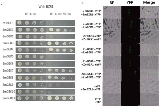 Previously, BZR1 was identified to interact with BIN2 and could be phosphorylated by BIN in Arabidopsis [31,32]. As BZR1 is a transcription factor and has to activate transcription to function, we investigated whether the fused BD-GSK3 protein interacted with AD-BZR1 using a yeast two-hybrid experiment. The results showed that ZmGSK1, ZmGSK3, ZmGSK4, ZmGSK7, ZmGSK8, and ZmGSK11 could interact with BZR1 (Figure 6a). The other ZmGSK proteins did not interact with BZR1. The ZmGSKs–ZmBZR1 interaction was further verified with bimolecular fluorescence complementation (BiFC) assays. ZmGSKs were fused to a C-terminal yellow fluorescent protein (YFP) fragment (ZmGSKs–cYFP), and the ZmBZR1 protein was fused to an N-terminal YFP fragment (ZmBZR1–cYFP). When fused ZmGSKs–cYFP was co-expressed with ZmBZR1–nYFP in onion, a YFP fluorescence signal was detected in transformed-cell nuclei (Figure 6b). No fluorescence was observed in negative-control experiments (Figure 6b). These results suggest that ZmGSKs kinase physically interacts with the ZmBZR1 transcription factor in plant-cell nuclei to participate in the BR pathway.