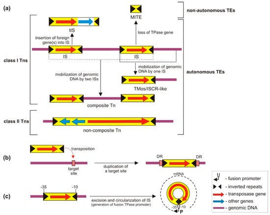 The main structural types and specific properties of bacterial TEs: (a) Simplified view of the structural diversity of class I and class II transposons. IS—insertion sequence; tIS—transporter IS; MITE—miniature inverted-repeat transposable element. The class II Tns are represented here by a Tn3 family element; (b) duplication of a target site during transposition and generation of directly repeated sequences (DRs) flanking the inserted TE; (c) divided promoter of a TPase gene. After IS circularization, the −10 and −35 hexamers form a strong fusion promoter (P) enabling efficient TPase expression.