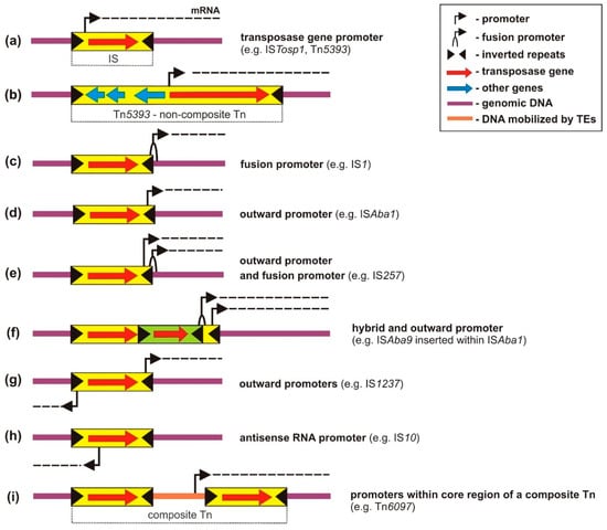 Some ISs possess complete (−35 and −10 hexamers) and also partial (−35 hexamer) outward-oriented promoters (Figure 2e). For example, IS257 (IS6 family) was found to drive transcription of a tetracycline resistance gene from a weak complete promoter as well as a strong fusion promoter [37]. A similar situation occurs in the case of the mosaic TE generated by ISAba1 and ISAba9, described above (Figure 2f).