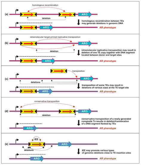 TE-mediated deletions can influence bacterial genomes at higher and lower levels of organization. Large-scale genome reduction (also known as streamlining) accompanies the transition of a free-living organism to an obligate pathogen [128], whereas single deletional events can modify the local transcriptional landscape by removing transcription terminators and generating novel promoter-gene combinations [129]. Such genomic alterations are of special interest in relation to AR, which can emerge if a poorly expressed or silent resistance determinant is brought under the control of a previously distant promoter. Deletions caused by TEs can be categorized according to the underlying molecular mechanism, which depends on the protein machinery involved. This taxonomic approach yields the following classes: (a) homologous recombination, (b) transposition, and (c) transposase-dependent activity of insertion sequence excision enhancer (IEE) protein.