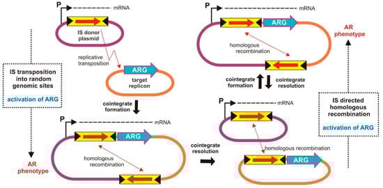 A very important role in horizontal transmission of AR genes is attributed to mobile genetic elements (MGEs), primarily transposable elements (TEs), but also plasmids and integrative conjugative or mobilizable elements (ICEs and IMEs), effective vehicles that facilitate and accelerate gene flux among bacteria [6]. TEs encode transposase (TPase), enzymes that catalyze the process of transposition, i.e., illegitimate recombination within one or between two DNA molecules at different, usually random, genomic locations [7]. Notably, TPase genes are the most prevalent genes in sequenced bacterial genomes and microbial metagenomes, which indicates that these recombinases significantly affect the structure and function of bacterial genomes [8]. In addition, they can promote diverse genetic rearrangements (insertions, deletions, inversions, duplications, and translocations) as well as the generation of transient cointegrate replicons, which stimulate the exchange of genes between different DNA molecules co-residing in a cell [9]. Moreover, due to their highly recombinogenic nature, TEs can mobilize chromosomal genes (including AR genes) for transposition and can introduce them, as an integral part of newly generated larger transposable units, into the pool of mobile DNA involved in HGT. A plethora of transposons (Tns) containing diverse AR genes have been identified in the nucleotide sequences of bacterial chromosomes and plasmids, thus, corroborating the role of TEs in the dissemination of resistance phenotypes [10,11,12]. An equally important feature of many TEs is their ability to provide (or generate) promoters that can drive or modulate the expression of genes located adjacent to the TE insertion site [13]. This phenomenon is particularly important given the relatively frequent occurrence of transcriptionally silent genes (including AR genes) in bacterial genomes.