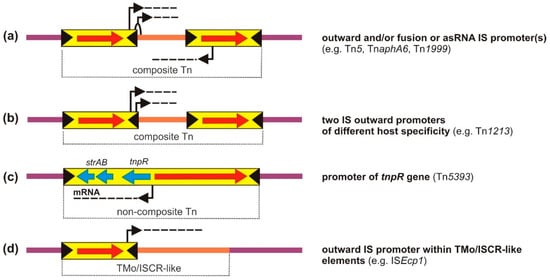Promoters enabling or modulating the expression of AR genes transferred within Tns: (a,b) fusion and outward IS promoters within composite Tns; (c) internal promoters within non-composite Tns; (d) outward IS promoters within TMo/ISCR elements. See text for details. Symbols are identical to those used in Figure 2.