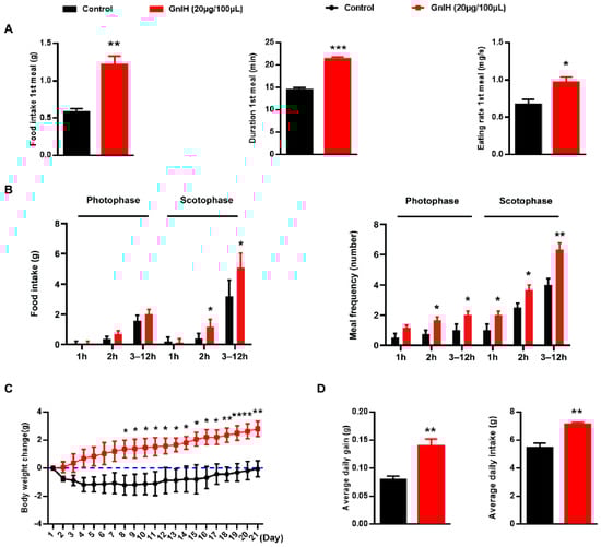 2.1. Chronic Intraperitoneally Injected GnIH Increases Male Mice Obesity and Photophase Food Intake and Alters Meal Microstructure