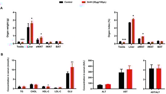 2.2. Chronic Intraperitoneally Injected GnIH Alters Organ Indexes and Serum Biochemical Indexes in Male Mice