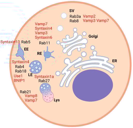 Scheme representing a generic animal cell. Rab proteins are located in the right compartments and the relative interacting SNARE proteins are labeled in red. EE—early endosome, RE—recycling endosome, LE—late endosome, Lys—lysosome, ER—endoplasmic reticulum, SV—secretory vesicle.