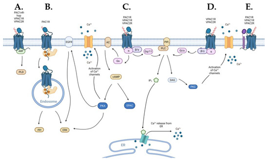 Schematic diagram of the signaling pathways activated by the PACAP subfamily of receptors (blue): (A) VPACRs and the PAC1R splice variant PAC1nR-hop can engage ADP-ribosylation factor (ARF) signaling, (B) endosomal signaling may be activated by β-arrestin (light-orange) recruitment to PAC1R, (C) VPAC1R, VPAC2R, and PAC1R directly engage Gs- and Gq/11-coupled pathways, (D) VPAC1R and VPAC2R also directly activate Gi/o-coupled pathways, and (E) PACAP subfamily of receptors can interact, in a receptor-specific manner, with receptor activity-modifying protein (RAMP) (purple) that can alter receptor signaling or trafficking. Abbreviations used in this figure: ARF—ADP-ribosylation factor, PLD—phospholipase D, ERK—extracellular signal-regulated kinase, EGFR—epidermal growth factor receptor, AC—adenylate cyclase, cAMP—3′,5′-cyclic adenosine monophosphate, PKA—protein kinase A, EPAC—exchange protein directly activated by cAMP, Ca2+—calcium, PLC—phospholipase C, PIP2—phosphatidylinositol 4,5-bisphosphate, IP3—inositol 1,4,5-trisphosphate, DAG—diacylglycerol, ER—endoplasmic reticulum, PKC—protein kinase C.