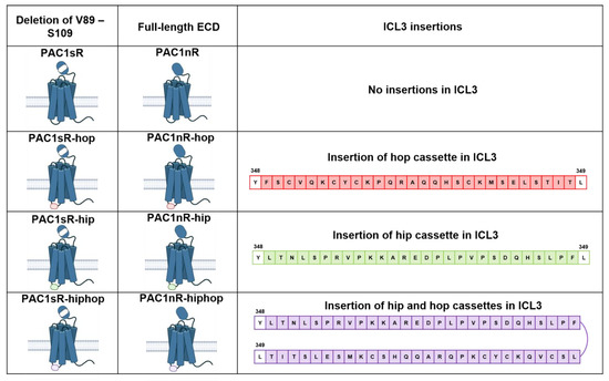 Schematic illustration of PAC1R splice isoforms occurring in the N-terminal extracellular domain (ECD) and/or intracellular loop 3 (ICL3) in humans. N-terminal ECD splice variation arises from the presence (PAC1R null a.k.a. PAC1nR) or deletion (PAC1R-short a.k.a. PAC1sR) of 21 amino acids (residues V89 to S109) from the N-terminal ECD. ICL3 splice variation arises from the inclusion of one or two of the cassette exons, the “hip” cassette (red) and the “hop” cassette (green) of 28 amino acids each, between residues Y348 and L349 of the PAC1R ICL3. Inclusion of the hip cassette in PAC1R leads to the splice isoform PAC1nR-hip or PAC1sR-hip. Inclusion of the hop cassette leads to the PAC1nR-hop or PAC1sR-hop splice isoform, while the inclusion of both hip and hop cassettes leads to PAC1nR-hiphop or PAC1sR-hiphop (purple).