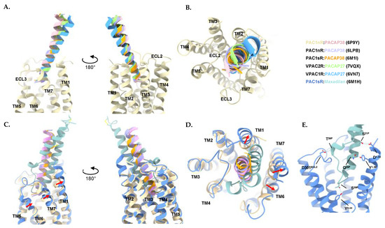 Of the six structures determined by cryo-EM to date, five were PACAP-bound. The three PACAP-PAC1R structures (PDB: 6P9Y, 6LPB, and 6M1I) share an agreement on the PACAP binding mode (Figure 4A,B). Of these structures, two are of the receptor splice variant with the full-length ECD, PAC1nR [131,135], while the other is of PAC1sR, missing twenty residues (Val89ECD–Ser109ECD) in the N-terminal ECD [134]. While this region of the ECD is critical for the binding affinity of VIP, with an almost hundred-fold improvement in binding affinity observed for PAC1sR compared to PAC1nR, the two receptor variants share similar PACAP binding affinities [175]. The additional residues in the ECD that are present in the PAC1nR splice variant have not been resolved in any of the cryo-EM structures to date, most likely due to high flexibility.