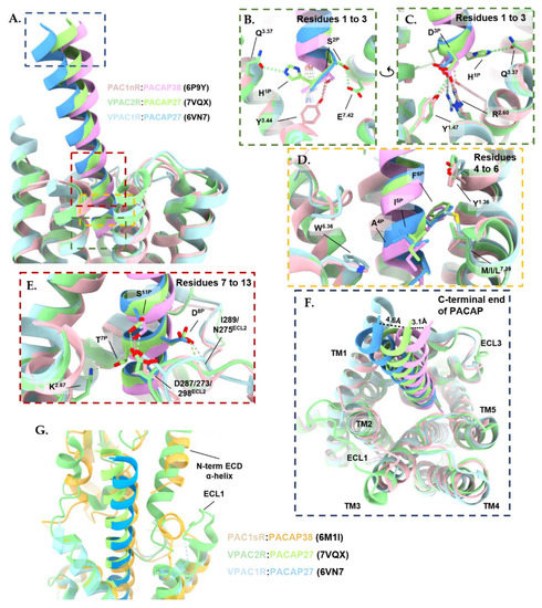 Comparison of PACAP in the binding pocket of VPAC1R (blue; PDB: 6VN7), VPAC2R (green; PDB: 7VQX) and PAC1nR (pink; PDB: 6P9Y). Structures were aligned by receptor chains and displayed as ribbons, with residues involved in hydrogen bonds (dotted lines) and hydrophobic interactions shown as a stick; calculated with ChimeraX 1.3 [310,311]. Extracellular domain (ECD) residues of the receptor were removed for clarity. Peptide residues are denoted with superscript P, extracellular loop residues are denoted as ECL. Receptor transmembrane (TM) residues are denoted using the Wootten numbering system. (A) Overview of comparison highlighting the regions of higher magnification displayed in panels (B–E) with matching colored dashed rectangles. (B,C) Close-up view of the hydrogen bonds formed between the first three residues of PACAP and the binding pocket of VPAC1R (blue), VPAC2R (green), and PAC1nR (pink). (D) Close-up view (front and back side view) of PACAP residues 4 to 6 that interact with conserved hydrophobic side chains in TM1 (Y1.36), TM5 (W5.36) and TM7 (M/I/L7.39) of the peptide binding pocket of VPAC1R (blue), VPAC2R (green) and PAC1nR (pink). (E) Close-up view of hydrogen bonds formed between PACAP from residue 7 to 13 and the binding pocket of VPAC1R (blue), VPAC2R (green), and PAC1nR (pink). (F) Close-up view of the C-terminal end of PACAP peptide that is shifted 4.6 Å towards the receptor core in VPAC2R compared to VPAC1R, while the C-terminal end of PACAP peptide is shifted 3.1 Å towards ECL3 in PAC1R compared to VPAC2R. Distance between the α-carbon of Leu27P in PACAP peptide between the three structures calculated with ChimeraX 1.3. (G) The N-terminal α-helix of the VPAC2R ECD (green; PDB: 7VQX) adopts a unique conformation that deeply inserts into a cleft between PACAP27 and the predicted position of ECL1 in the model compared to the modeled ECD in the PACAP38-bound PAC1sR (yellow; PDB: 6M1I). Due to limited resolution in the N-terminal ECD and ECL1, these regions are not modeled in the PACAP27-bound VPAC1R structure (blue; PDB: 6VN7).
