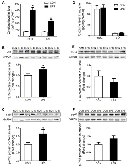 The pro-inflammatory cytokines tumor necrosis factor α (TNF-α) and interleukin-6 (IL-6) were significantly increased (p < 0.05) in the liver of LPS-challenged piglets (Figure 1A), which was associated with significantly up-regulated (p < 0.05) TLR-4 (Figure 1B) and p-p65 NF-κB (Figure 1C) proteins. In contrast, no responses to LPS challenge were detected in any of these parameters in the muscle (Figure 1D–F).