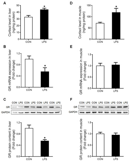 The tissue content of cortisol was significantly increased (p < 0.05) in both liver (Figure 2A) and muscle (Figure 2D) under LPS treatment. However, a significant down-regulation (p < 0.05) of total GR at both mRNA (Figure 2B) and protein (Figure 2C) levels was detected in the liver but not in the muscle (Figure 2E,F).