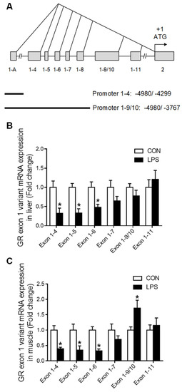 2.3. Transcriptional Regulation of GR in Liver and Muscle under LPS Treatment