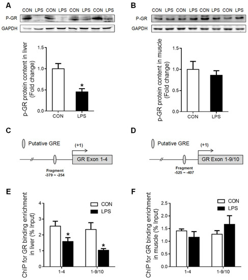 Western blot analysis showed that phosphorylated GR (p-GR) was significantly decreased (p < 0.05) in the liver (Figure 4A) but unchanged in the muscle (Figure 4B). A putative glucocorticoid response element (GRE) was predicted on the promoter region of both GR exon 1–4 (Figure 4C) and 1–9/10 (Figure 4D). ChIP analysis showed that GR binding with GR promoter 1–4 and 1–9/10 was significantly down-regulated (p < 0.05) in LPS-treated porcine liver (Figure 4E), but no alterations were detected in the muscle (Figure 4F).