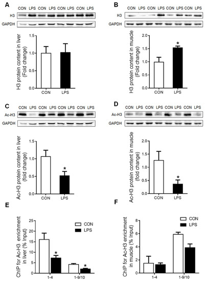 Moreover, histone H3 protein content was unchanged in the liver (Figure 5A) but significantly up-regulated (p < 0.05) in the muscle (Figure 5B) of LPS-treated piglets. Nevertheless, the global histone H3 acetylation level was significantly reduced (p < 0.05) both in the liver (Figure 5C) and the muscle (Figure 5D) upon LPS challenge. ChIP assay showed that the enrichment of histone H3 acetylation on GR promoters 1–4 and 1–9/10 was significantly decreased (p < 0.05) in the liver of LPS-treated piglets (Figure 5E), while no change was detected in the muscle (Figure 5F).