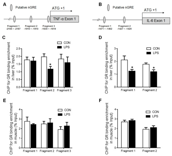 Several putative negative glucocorticoid response elements (nGRE) were predicted on promoter regions of TNF-α (Figure 6A) and IL-6 (Figure 6B) genes using the bioinformatics method (www.gene-regulation.com). The binding of GR to these putative nGREs in liver and muscle tissues was validated by using ChIP-qPCR. GR binding to fragment 2 of the TNF-α (Figure 6C) gene promoter, as well as to both fragment 1 and 2 of the IL-6 gene promoter, was significantly decreased (p < 0.05) in the liver upon LPS challenge (Figure 6D). However, no changes in GR binding to TNF-α or IL-6 gene promoters were detected in the muscle in response to LPS challenge (Figure 6E,F).