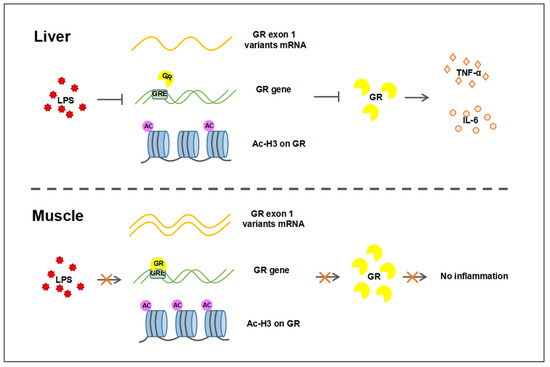 Different transcriptional regulation of GR in liver and muscle after LPS challenge. The decrease in GR expression in the liver after LPS stimulation was associated with the decrease in GR exon 1–4/5/6 expression, the binding of GR to GRE, and the acetylation of H3. Decreased GR results in increased expression of inflammatory factors TNF-α and IL-6, leading to an inflammatory response. In muscle, LPS did not affect the expression of GR, so there was no inflammatory response. Arrows for promotion, lines for inhibition, and crosses for no influence.