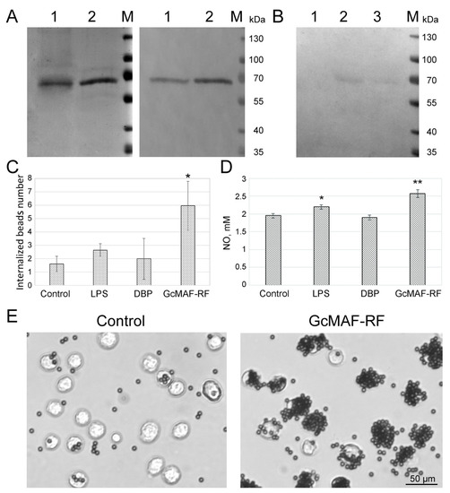 Characterization of DBP and DBP-derived GcMAF-RF. (A) Polyacrylamide gel of DBP samples obtained using actin-agarose (1), and Sepharose (with 25-hydroxyvitamin D3) (2) affinity chromatography (left) and Western blot of these samples with antibodies against Gc group proteins (right). (B) Western blot of a polyacrylamide gel for Helix pomatia lectin. 1—DBP, 2—GcMAF-RF, and 3—FBS. M—Thermo ScientificTM Page RulerTM Prestained protein Ladder molecular marker (Thermo Fisher Scientific Inc., Waltham, MA, USA). (C) Phagocytic activity of murine PMs treated with LPS, DBP, and GcMAF-RF compared to control untreated macrophages. Data are presented as Mean ± SD (n = 4), * differences compared to the control are significant, p < 0.05 (Mann–Whitney U test). (D) NO production by murine PMs treated with LPS, DBP, and GcMAF-RF compared to control untreated macrophages. Data are presented as Mean ± SD (n = 5), differences compared to the control are significant, * p < 0.05, ** p < 0.01 (Mann–Whitney U test). (E) Images of the beads phagocytized by naïve macrophages (control) and macrophages exposed to GcMAF-RF.