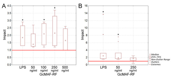 Ex vivo analysis of the effect of GcMAF-RF on immunocompetent cells. (A) Allostimulatory activity of human DCs activated by either the standard activator LPS or various concentrations of GcMAF-RF. The allostimulatory activity of DCs in the absence of activators was taken to be unity (red line). * significant differences from DCs without activators, p < 0.05 (Mann–Whitney U test). (B) The effect of GcMAF-RF on M1 polarization of human macrophages. Polarization was assessed based on allostimulatory activity of M1 polarized macrophages. LPS and GcMAF (50 and 250 ng/mL) were used as maturation inducers. Allostimulatory activity of intact macrophages was taken to be unity (red line). * significant differences from unstimulated macrophages, p < 0.01 (Mann–Whitney U test). Impact—the ratio between stimulated DCs or macrophages and intact ones.