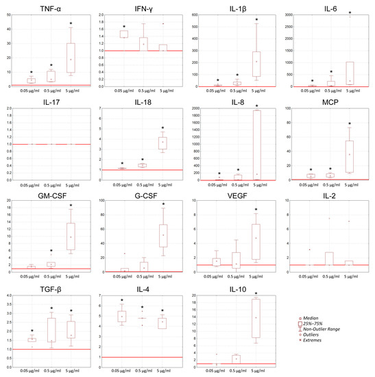 Induction of cytokine production by GcMAF-RF-activated whole blood cells of healthy donors. The Y axis represents the impact index: the ratio between cytokine production after exposure to GcMAF-RF at a certain concentration and constitutive cytokine production taken as unity (red line). * significant differences in cytokine production after exposure to GcMAF-RF relative to constitutive cytokine production (n = 6), p < 0.05 (Mann–Whitney U test).