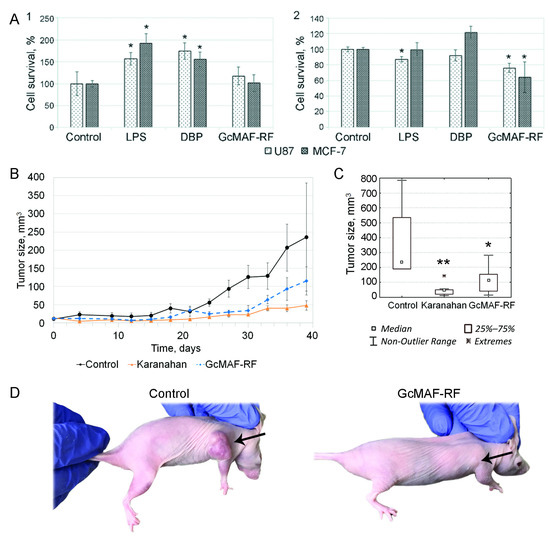The antitumor effect of GcMAF-RF. (A) The cytotoxic effect of GcMAF-RF on U87 and MCF-7 cancer cells. 1—direct cytotoxicity; 2—PM-mediated cytotoxicity. Mean ± SD values are shown (n = 3); * p < 0.05—significance of differences compared to the control (Mann–Whitney U test). (B–D) The effects of Karanahan therapy and GcMAF-RF administration alone on human U87 glioblastoma inoculated subcutaneously in immunodeficient mice. (B) Graph demonstrating growth of a human U87 glioblastoma graft. Mean ± SEM values are shown. (C) Graph showing graft volumes at the terminal stage (39 days after therapy initiation). Significance of differences (* p < 0.05; ** p < 0.01, Mann–Whitney U test). (D) Photographs of control group mice and animals receiving GcMAF-RF, 39 days after therapy initiation. Arrows indicate tumors.