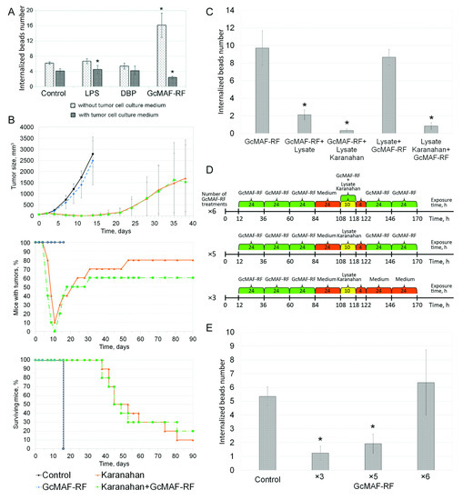 Analysis of antitumor properties of GcMAF-RF. (A) Effect of tumor cell culture medium on the ability of GcMAF-RF to activate murine PMs. Mean ± SD values are shown (n = 4). * significant differences from the corresponding control, p < 0.05 (Mann–Whitney U test). (B) Effects of the Karanahan therapy alone and Karanahan therapy in combination with GcMAF-RF in mice with Lewis carcinoma. Mean ± SD values are presented. (C) Loss of specific phagocytic activity by murine PMs due to treatment with tumor lysate. Macrophages were either treated with GcMAF-RF alone, GcMAF-RF and Lewis carcinoma tumor lysate, GcMAF-RF and Lewis carcinoma tumor lysate obtained from mice on day 7 after Karanahan therapy, or first exposed to corresponding tumor lysates and then activated by GcMAF-RF. PM pretreatment scheme is given in Supplementary Data S2, Figure S3. The values of PM activation indices (Mean ± SD) are presented. * significant differences from GcMAF-RF, p < 0.05 (Mann–Whitney U test). (D) Schematic representation of the search for regimens of PM treatment. (E) Phagocytic activity of PMs in the absence of additional treatments (control), treated with GcMAF-RF three, five, or six times with a 24-h interval, and treated with a Lewis carcinoma lysate obtained from mice on day 7 after the Karanahan therapy. The values of PM activation indices (Mean ± SD) are shown. * significant differences from the control, p < 0.05 (Mann–Whitney U test).