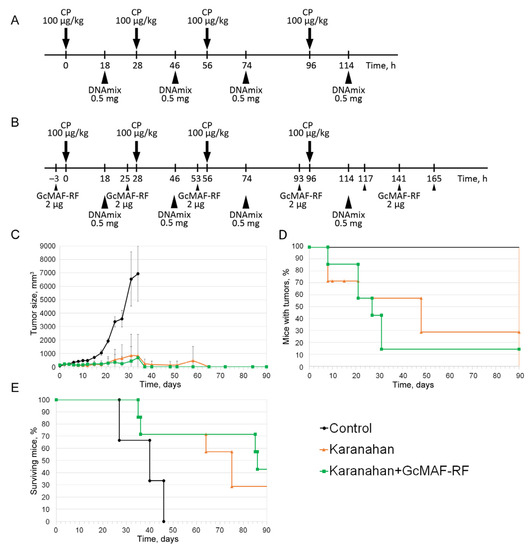 Comparison of the antitumor efficacy of the Karanahan approach alone and in combination with intratumoral injections of GcMAF-RF in the model of weakly immunogenic Lewis carcinoma. (A) Therapeutic regimen for treating Lewis carcinoma using the Karanahan approach. (B) Therapeutic regimen for treating Lewis carcinoma using the Karanahan approach in combination with intratumoral injections of GcMAF-RF. Arrows indicate intraperitoneal injections, arrowheads—intratumoral. (C) Changes in tumor growth in the study and control groups. Mean ± SD values are shown. (D) Changes in the number (%) of mice with tumors. (E) Animal survival graph.