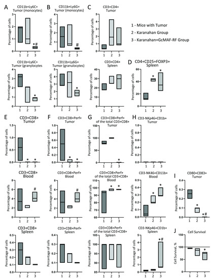 The additive effect of GcMAF on primary induction of the immune response by Karanahan therapy in mice with Lewis carcinoma on day 16. (A) CD11b + LyC + cells. (B) CD11b + LyG+ cells. (C) CD3 + CD4 + cells. (D) CD4 + CD25 + FOXP3+ cells. (E) CD3 + CD8 + cells. (F) CD3 + CD8 + Perf + killer T cells. (G) CD3 + CD8 + Perf + cells among CD3 + CD8 + cells. (H) CD3-NKp46 + CD11b + cells. (I) CD80 + CD83 + cells. The black asterisk shows a significant difference between the control and experimental groups. The hash stands for a significant difference between the experimental groups. The confidence level is p < 0.05 (Mann–Whitney U test, n = 3). (J) Cytolytic activity of PMs against Lewis carcinoma cells. Median (line) with interquartile range (box) are shown.