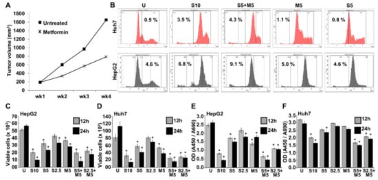 Metformin improved the efficacy of sorafenib in HCC cells. (A) Line graph represents the tumor progression curve of HepG2 -derived tumors treated with vehicle and metformin (200 mM). (B) Cell cycle analysis of HepG2 and Huh7 cells treated with 10 µM sorafenib (S10), 5 µM sorafenib (S5), 5 mM metformin (M5), and the combination of 5 µM sorafenib and 5 mM metformin (S5 + M5). (C–F) HepG2 and Huh7 were treated with 10 µM, 5 µM, and 2.5 µM sorafenib (S10, S5, S2.5) and/or 5 mM metformin (M5) either alone or in combination for 12 and 24 h, respectively. (C,D) Trypan blue dye exclusion assay was performed to assess cell survival. Graphs represent the number of viable cells. (E,F) XTT assay was performed to assess cell viability. Graphs represent the optical density of absorbance at 450/690 of the samples. * p < 0.05.