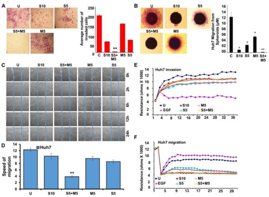 Combination treatment with metformin and sorafenib decreased the invasive and migratory potential of HCC cells. (A–F) Huh7 cells were treated with 10 µM sorafenib (S10), 5 µM sorafenib (S5), 5 mM metformin (M5), and the combination of 5 µM sorafenib and 5 mM metformin (S5 + M5) and subjected to various assays. (A) Representative images of Huh7 cells invaded through matrigel. Graph shows the number of Huh7 cells invaded through matrigel chambers. (B) Representative images of Huh7 spheroids incubating in treatments as indicated. Graph showing the distance migrated from the spheroids. (C,D) Representative images of Huh7 cells migrating through a scratch in a wound-healing assay. Images were captured at 0, 2, 6, 12, and 24 h. Graph showing the speed of migration of Huh7 cells treated with different drug combinations as indicated. (E) HUVEC monolayer was challenged with Huh7 cells in the presence of drugs as indicated. Change in resistance is shown here. (F) Huh7 cells were cultured on fibronectin-coated ECIS cellware and treated with drugs as indicated. Change in resistance is shown here as cells migrate on the electrode. * p < 0.05; ** p < 0.001.